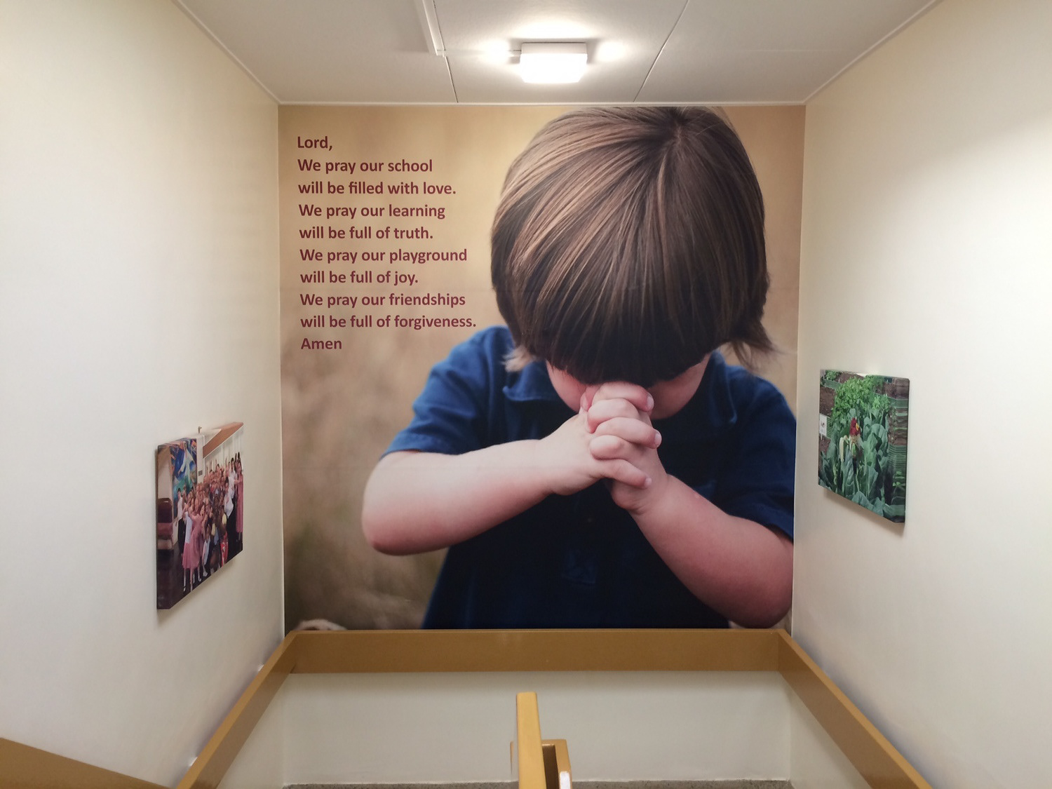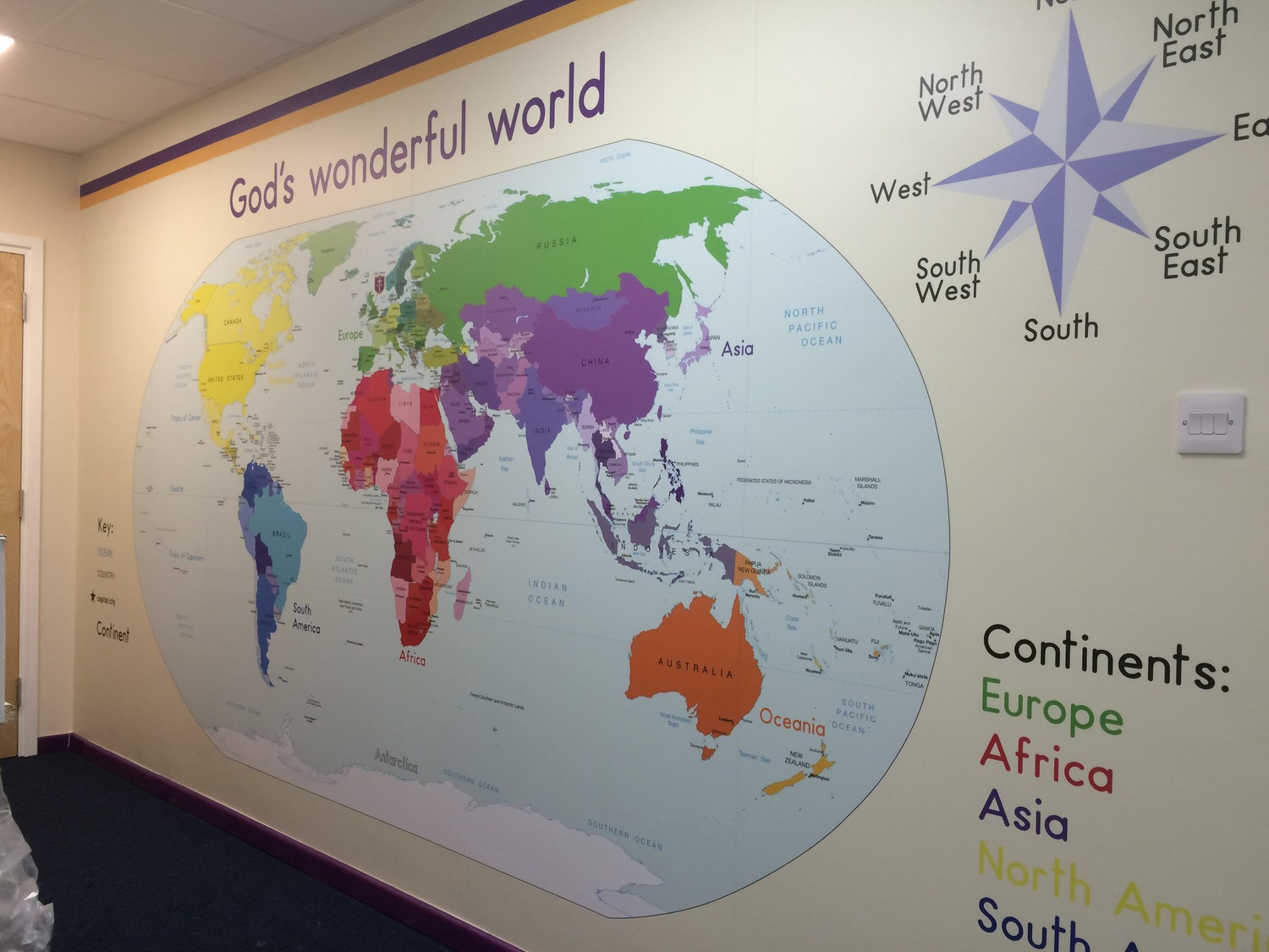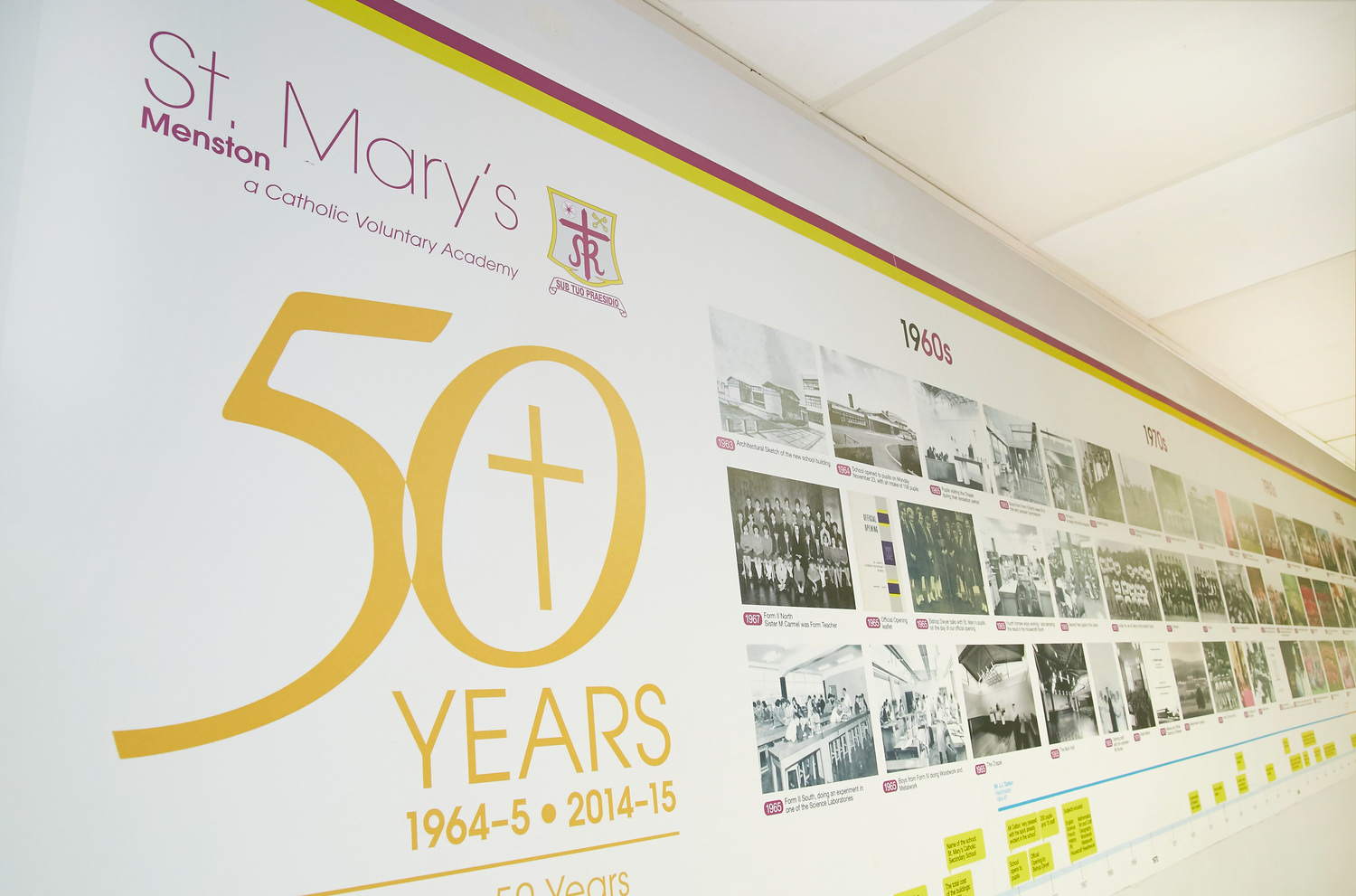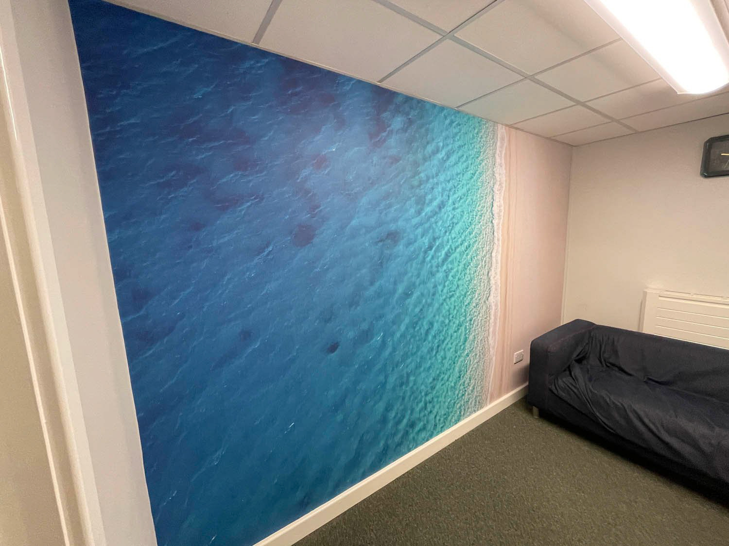 Wallpaper material can be used for displays. It is possible to print very large, detailed images to the wallpaper. The wallpaper is removable so it can be moved around from place to place.