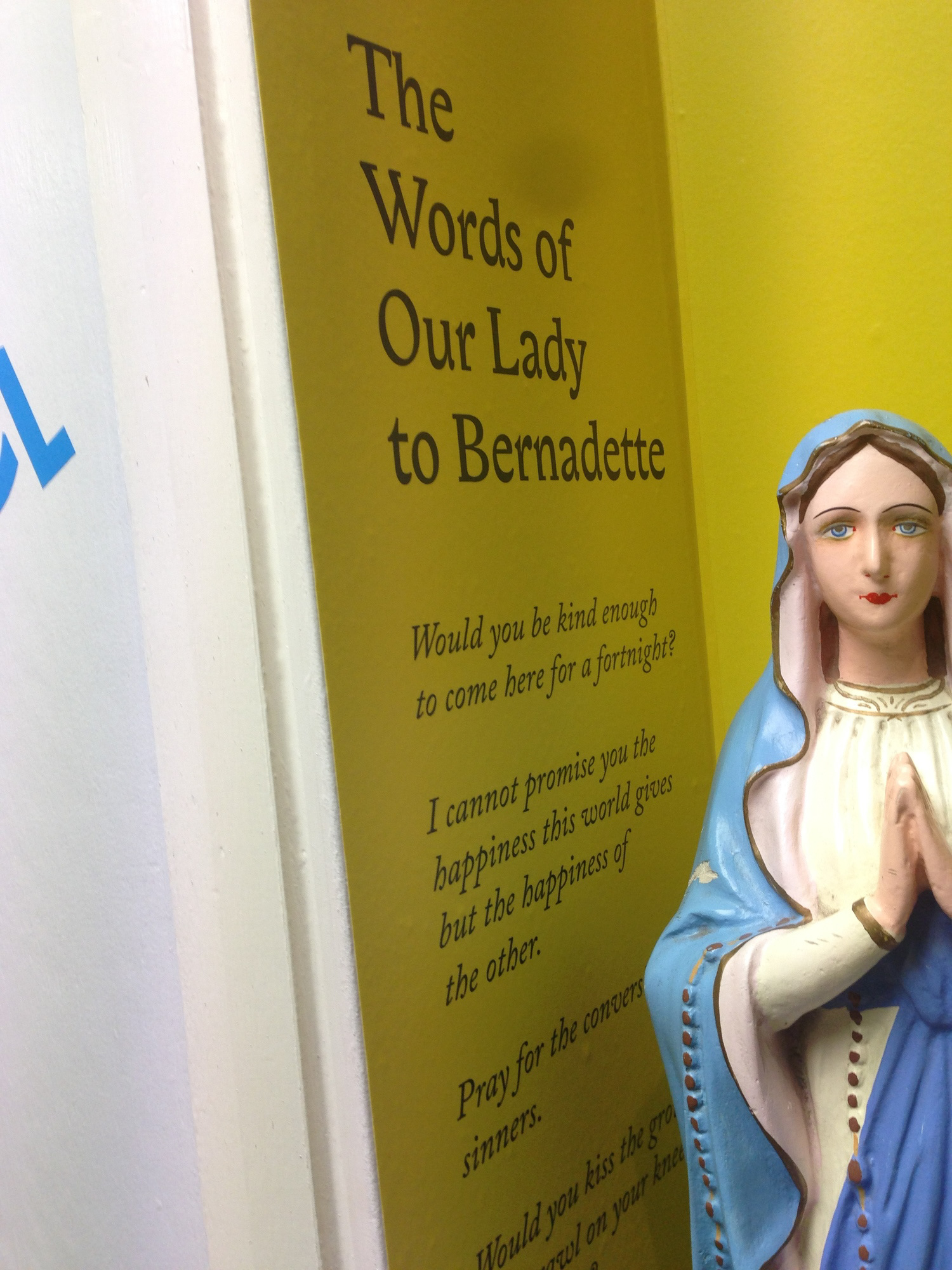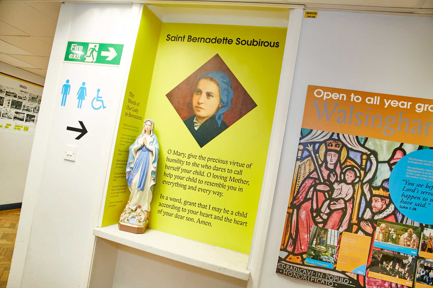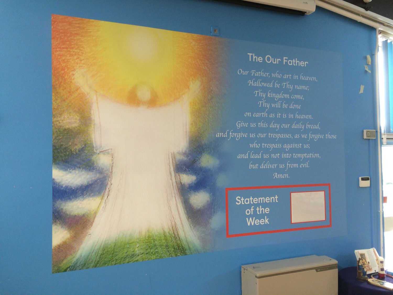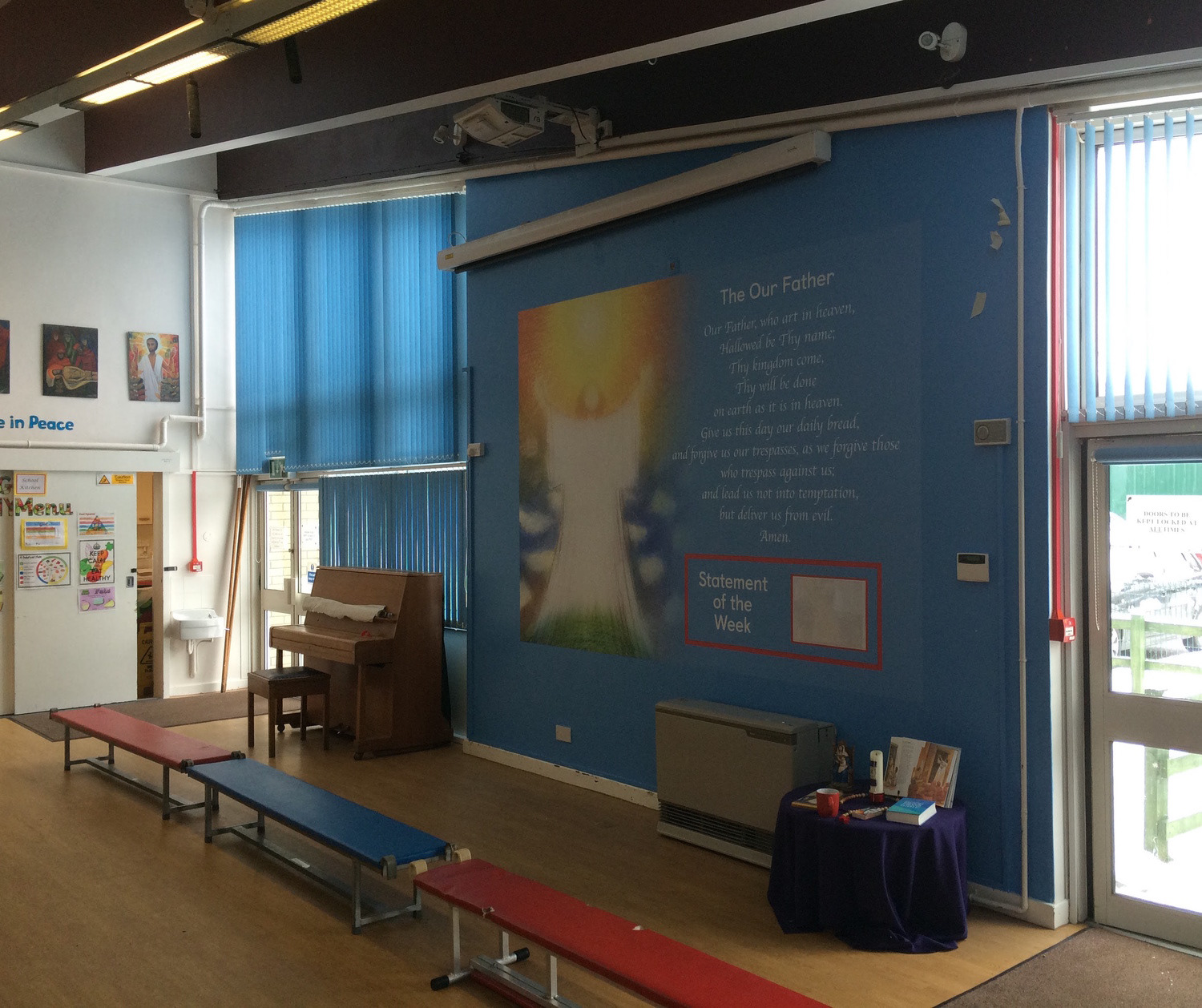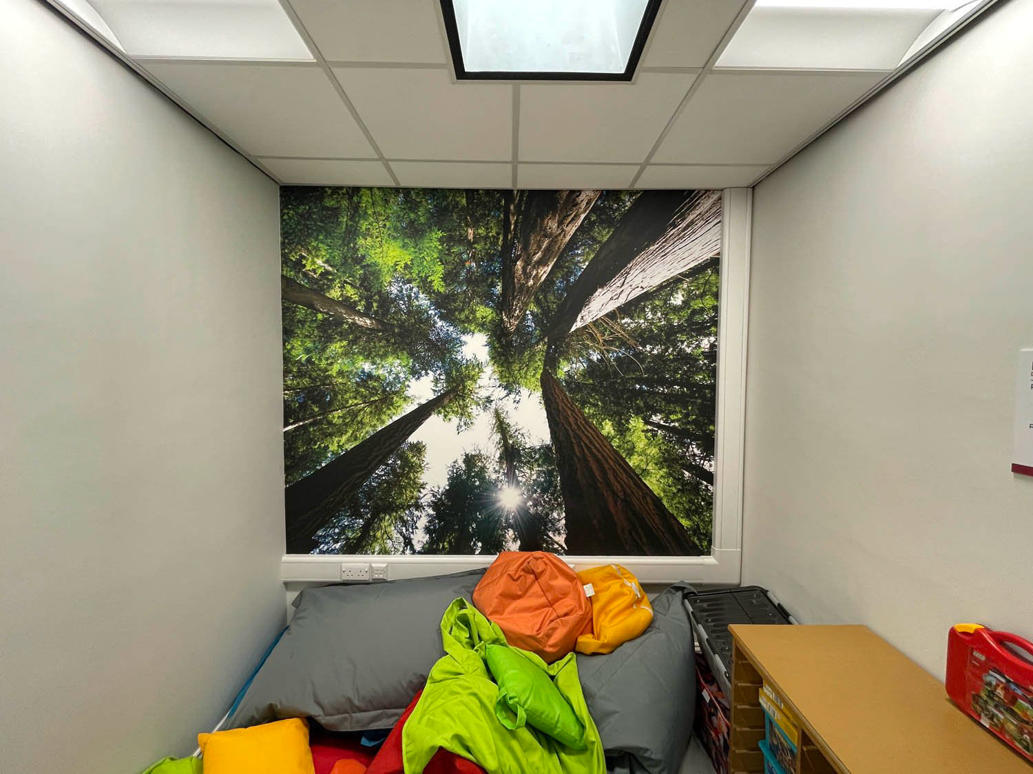 Wallpaper material can be used for displays. It is possible to print very large, detailed images to the wallpaper. The wallpaper is removable so it can be moved around from place to place.